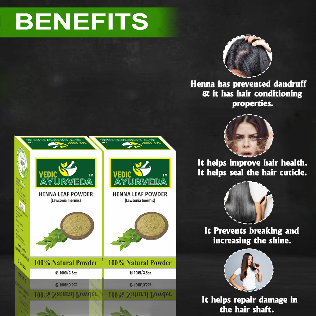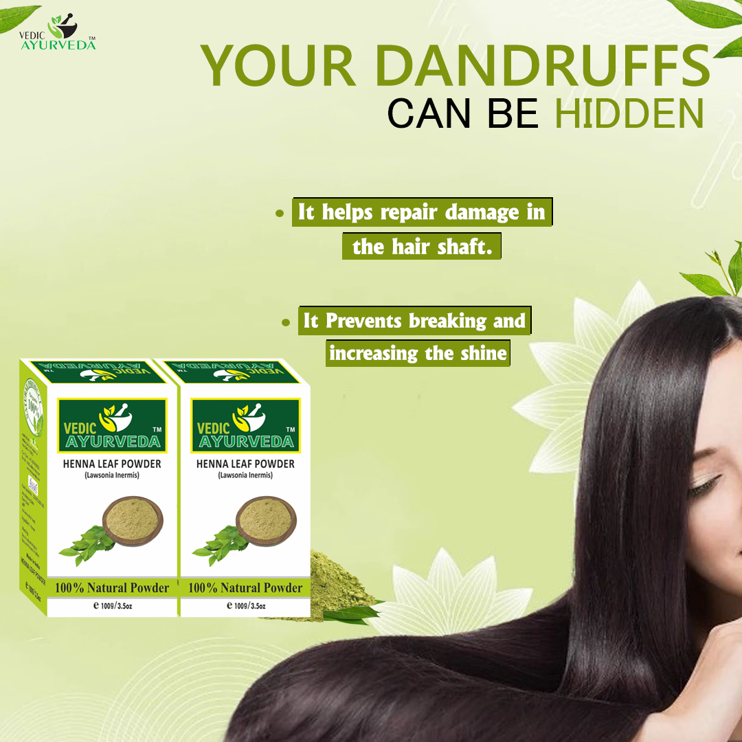 - Vedicayurveda Henna Leaf Powder prevents Dandruff & has hair conditioning properties. It helps repair damage in the hair shaft.