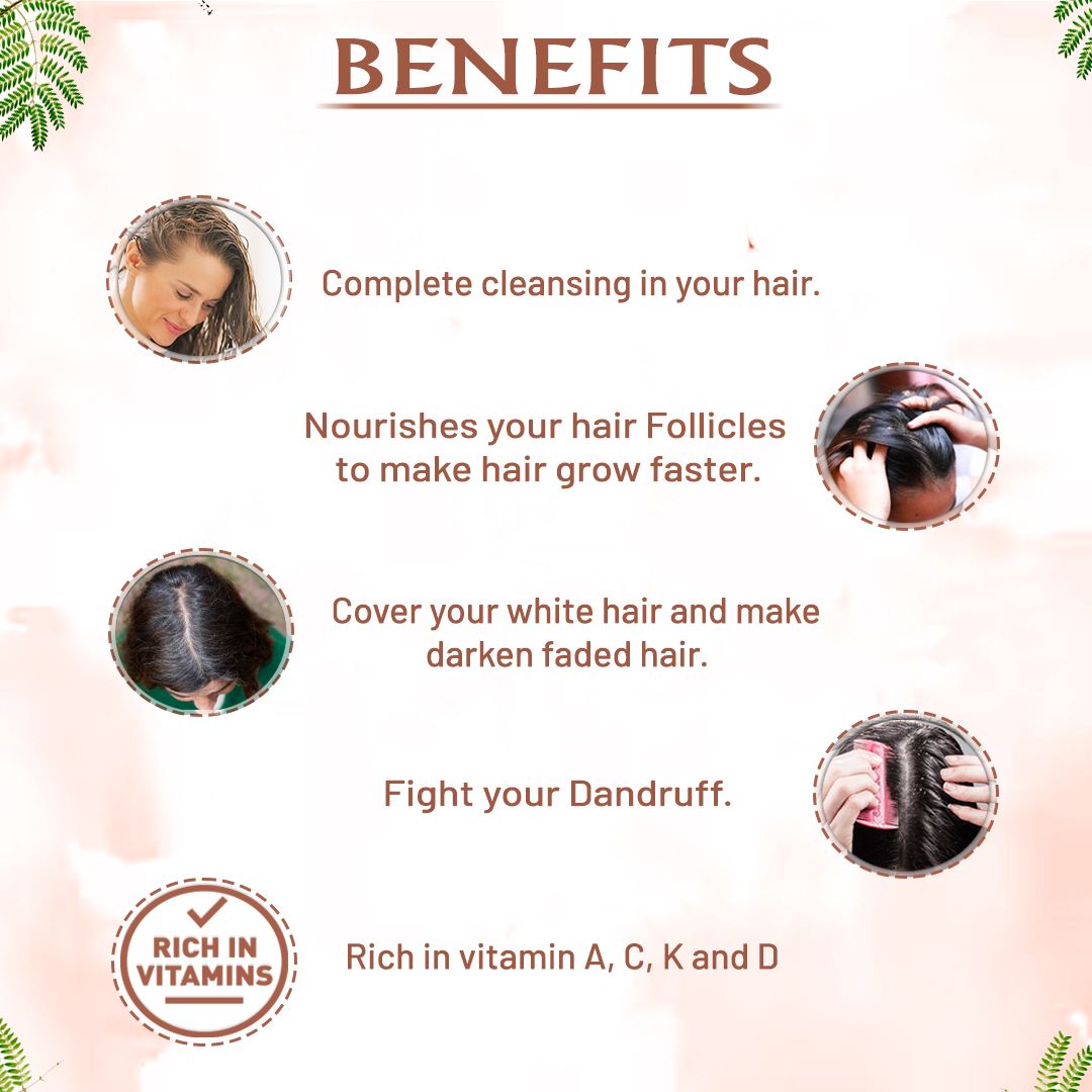 It will cover your white hair and add dark faded shade. Shikakai can clean your scalp and relieve itchings and damaged hair. Shikakai is also rich in antioxidants. and also added vitamin A, C, K, and D to make Nourishes your hair.