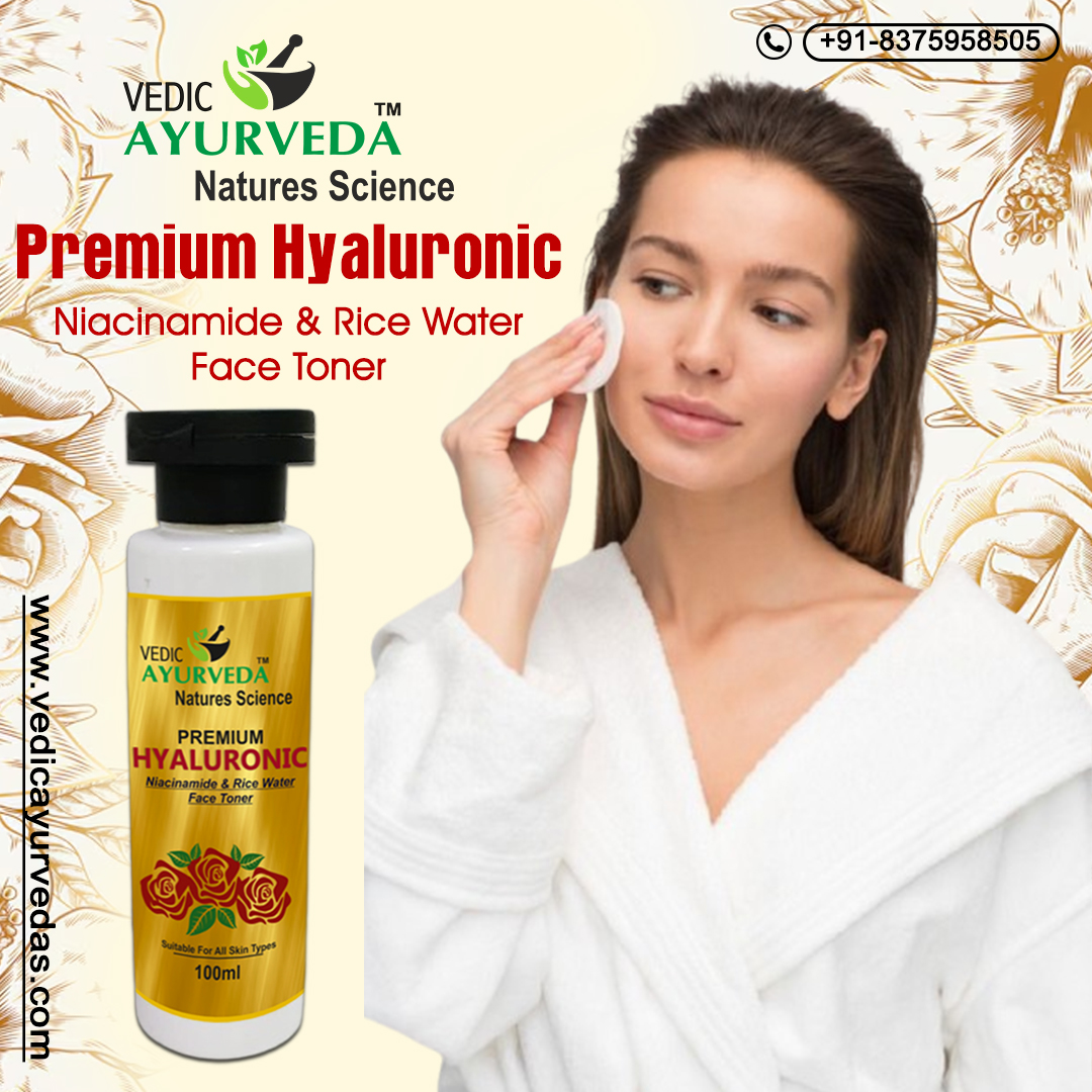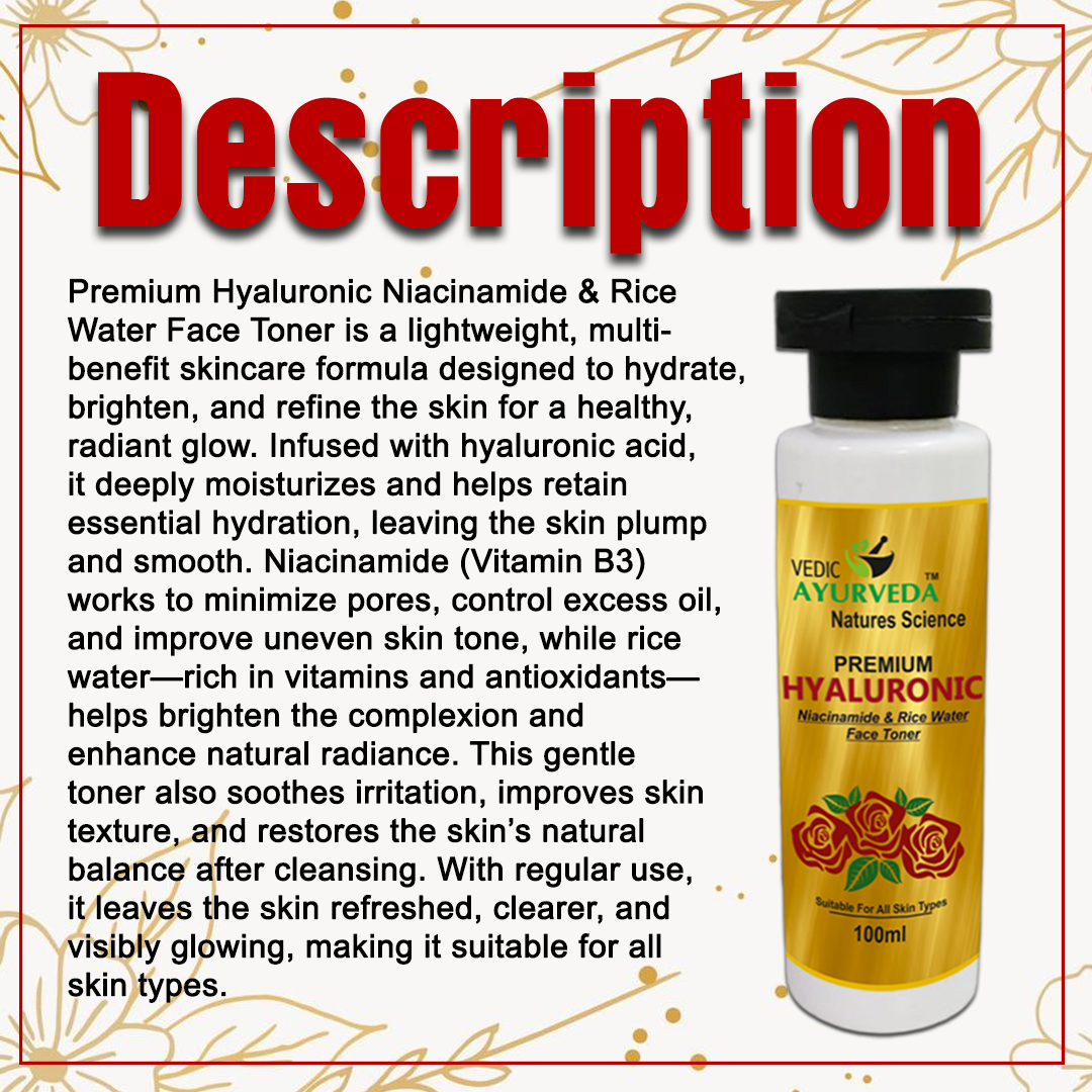 Premium Hyaluronic Niacinamide & Rice Water Face Toner is a nourishing and hydrating skincare formula designed to refresh, brighten, and balance the skin. Enriched with hyaluronic acid, it deeply hydrates the skin and helps retain moisture, making the skin appear plump and smooth. Niacinamide (Vitamin B3) helps minimize pores, control excess oil, and improve uneven skin tone, while rice water is rich in vitamins and antioxidants that help brighten the complexion and enhance natural glow. Premium hyaluronic Niacinamide & Rice Water Face Toner lightweight toner also helps soothe irritation, refine skin texture, and prepare the skin for better absorption of serums and moisturizers. Regular use leaves the skin feeling refreshed, hydrated, clearer, and naturally radiant.